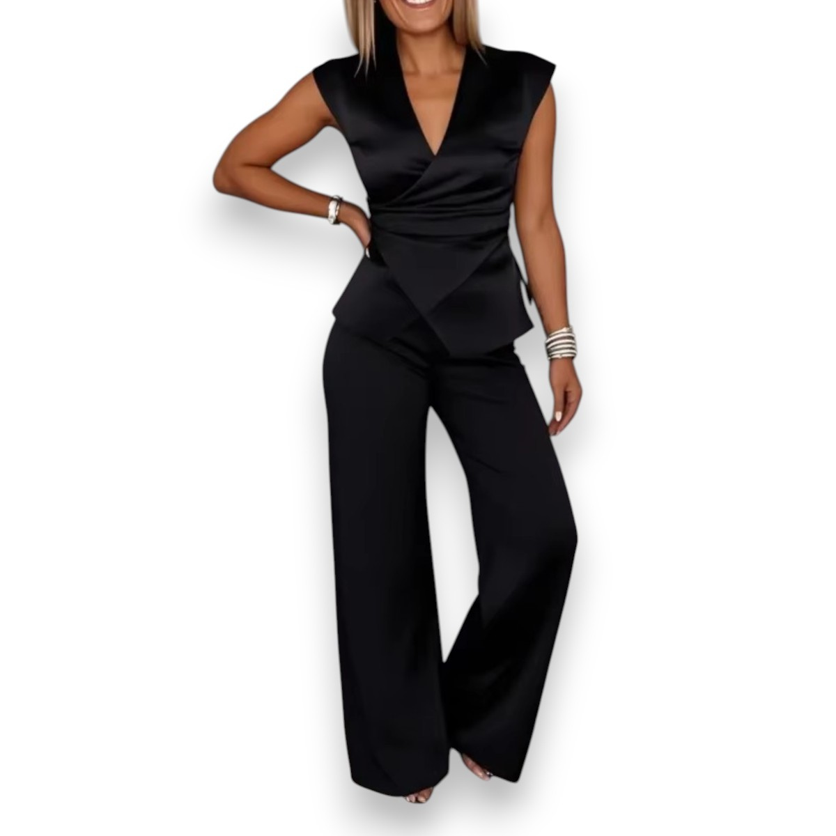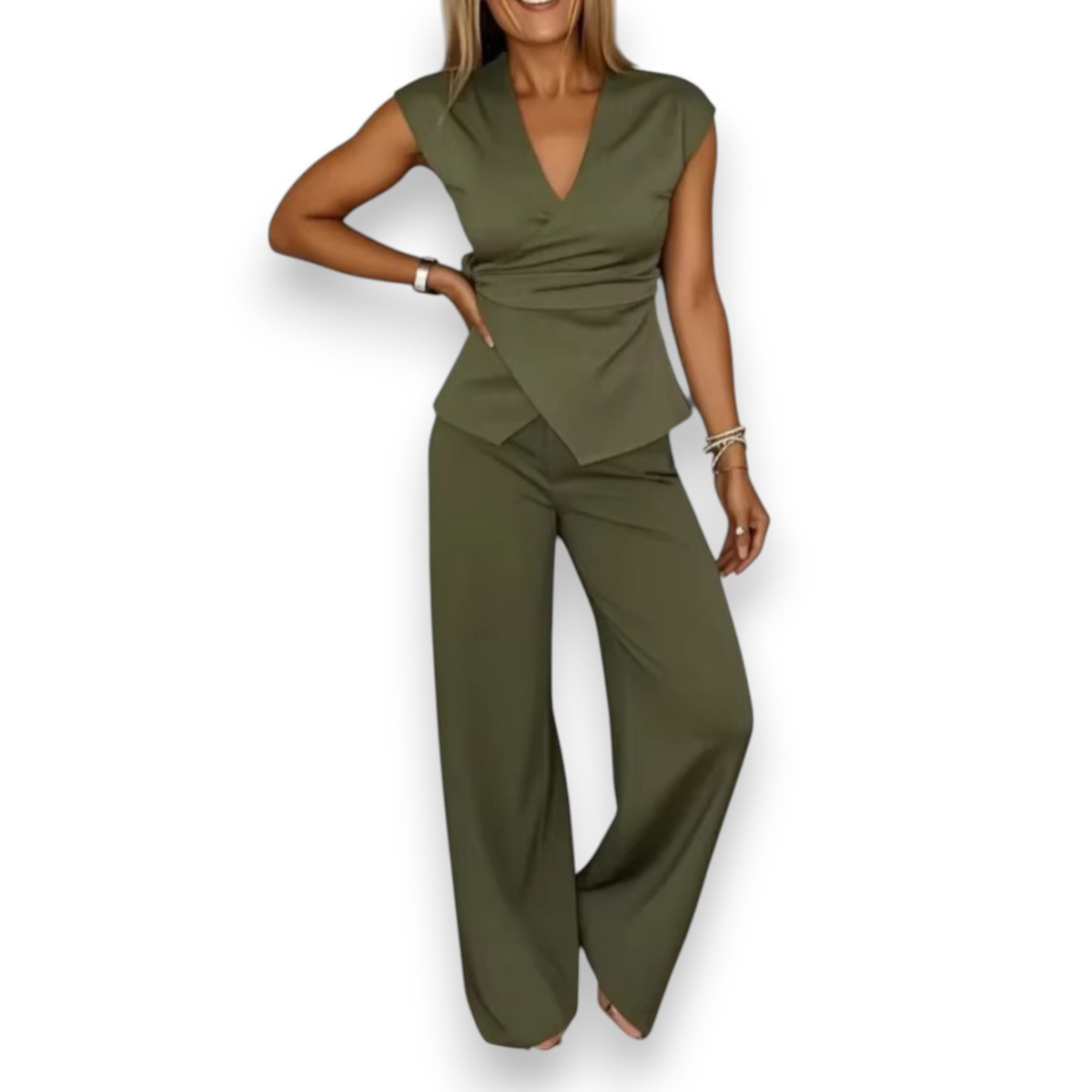 - Included: 1 × Women’s elegant set (V-neck top + trousers)