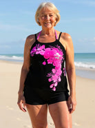 The comfortable halter top offers a secure, supportive fit that enhances your natural shape while staying comfortable all day. Sewn-in padding means no shifting, and the wide floral straps feel soft against your skin. Paired with smooth mid-rise bottoms featuring gentle tummy support and a flattering fit, this set is designed to give you confidence with every splash and every stroll along the shore.