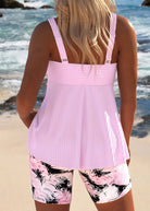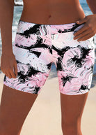 - Details: Ruched surplice top, adjustable straps, feather-print bike shorts.