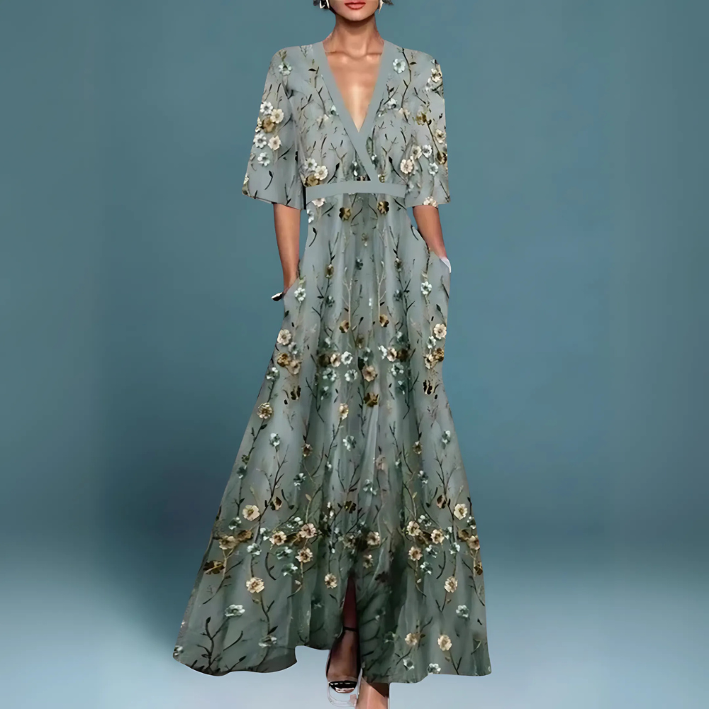 Bring a breath of freshness and style to your wardrobe with this elegant dress. Made from a lightweight and flowing fabric, the dress features a vibrant floral print that captures the essence of a garden in full bloom. The delicate V-neckline and three-quarter sleeves add a touch of femininity and grace, while the waist belt defines the silhouette. The wide and fluid skirt creates a graceful movement with every step.